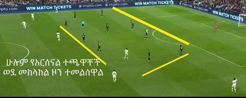 አርሰናል ከትልልቆቹ ቡድኖች የሚለይበት አንድ ነገር ያለ ይመስለኛል። አብዛኛዎቹ ቡድኖች በጥልቀት በሚከላከሉበት ወቅት ቢያንስ የአንድ ወይም የሁለት ተጫዋቾችን የመከላከል ጫናን ያቀሉላቸዋል። በጥልቀት በሚከላከሉበት ጊዜ 9+1 ወይም 8+2 ሊባል ይችላል። ይህ ከጫና ማምለጫ መንገድ ይሰጣቸዋል። በተለይ የጎል አስቆጣሪዎቻቸውን በመከላከል ብዛት የሚመጣ ድካም በመቀነስ በተቃራኒው ሳጥን ኳስ በሚያገኙበት ጊዜ ፍሬሽ እንዲሆኑ ያግዛል።