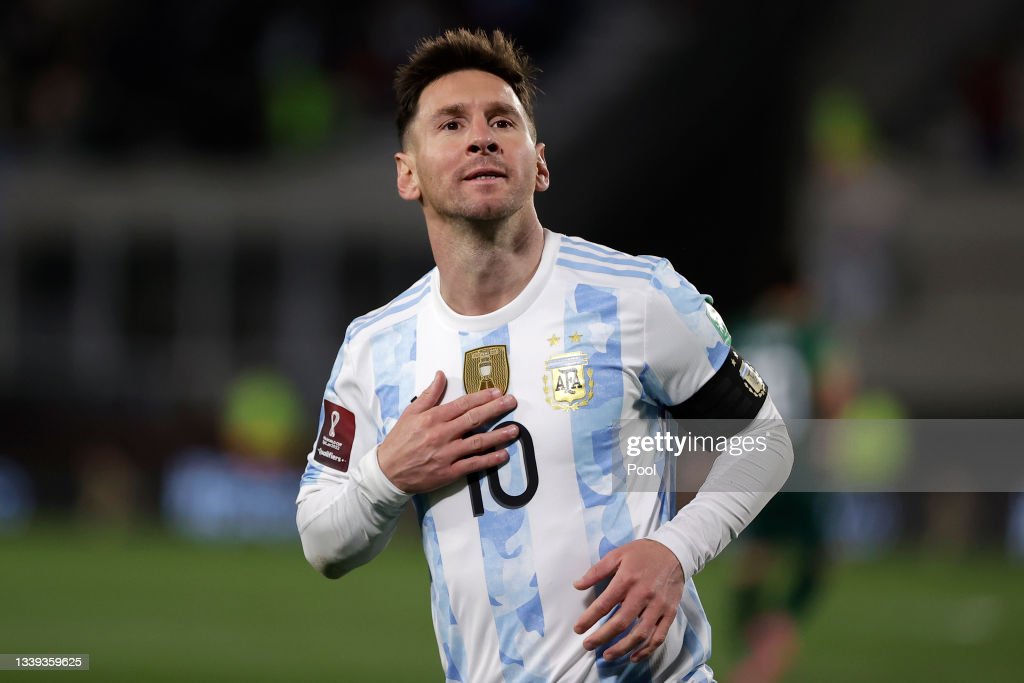 BUENOS AIRES, ARGENTINA – SEPTEMBER 09: Lionel Messi of Argentina celebrates after scoring the opening goal during a match between Argentina and Bolivia as part of South American Qualifiers for Qatar 2022 at Estadio Monumental Antonio Vespucio Liberti on September 09, 2021 in Buenos Aires, Argentina. (Photo by Juan I. Roncoroni – Pool/Getty Images)
